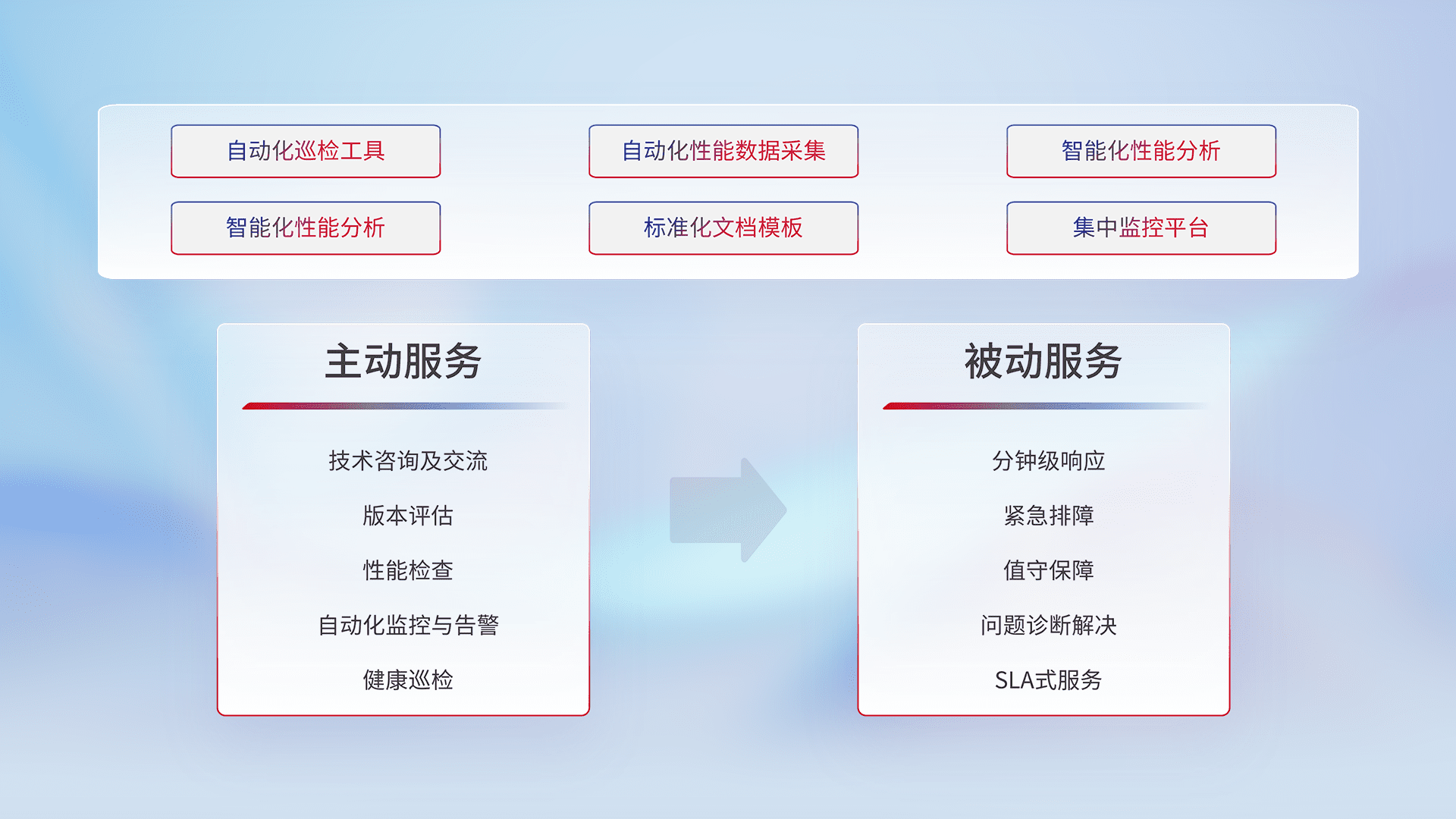 智能化工具和标准化文档,,,,保障服务质量,,提供主动服务(包含技术咨询、、版本评估、、、性能检查、、、自动化监控与告警、、、健康巡检)和被动服务包含(分钟级响应、、、、紧急排障、、值守保障、、、问题诊断解决、、、SLA服务)。。。。